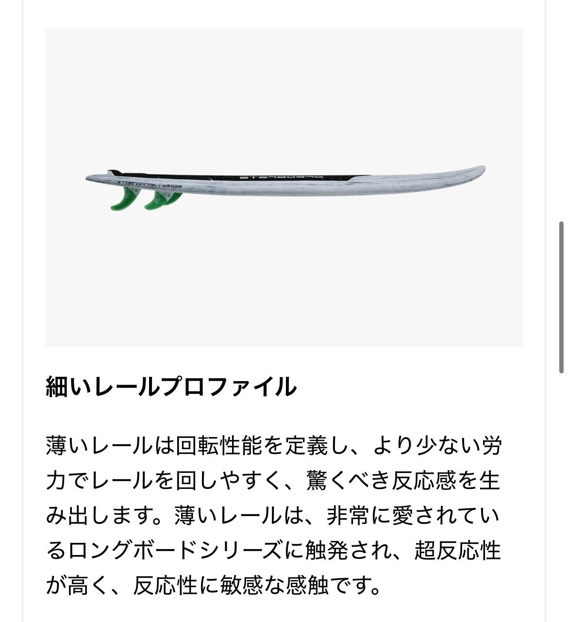 • 特徴: シリーズで最も短く、俊敏性に優れるショートボードに近いフィーリングを持つ。薄いレール形状により、幅広ながらも狭いボードのような反応性とコントロール性を提供します。